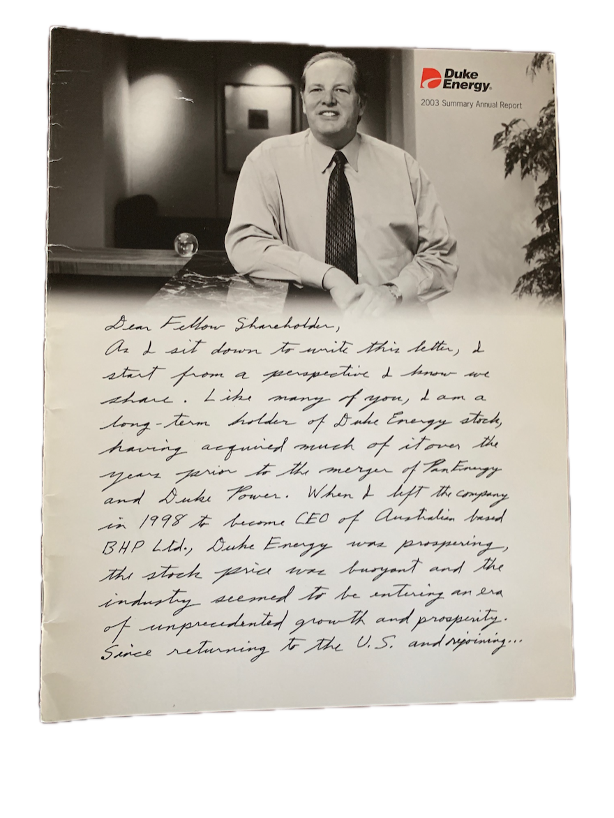 As part of that faith restoration Paul felt that he needed to show the Duke stakeholders that he was seriously and personally committed to turning the company around. He insisted on hand-writing the cover for Duke's 2003 Annual Report. As Paul put it, "he wasn't going to let the PR Department sanitize the situation."